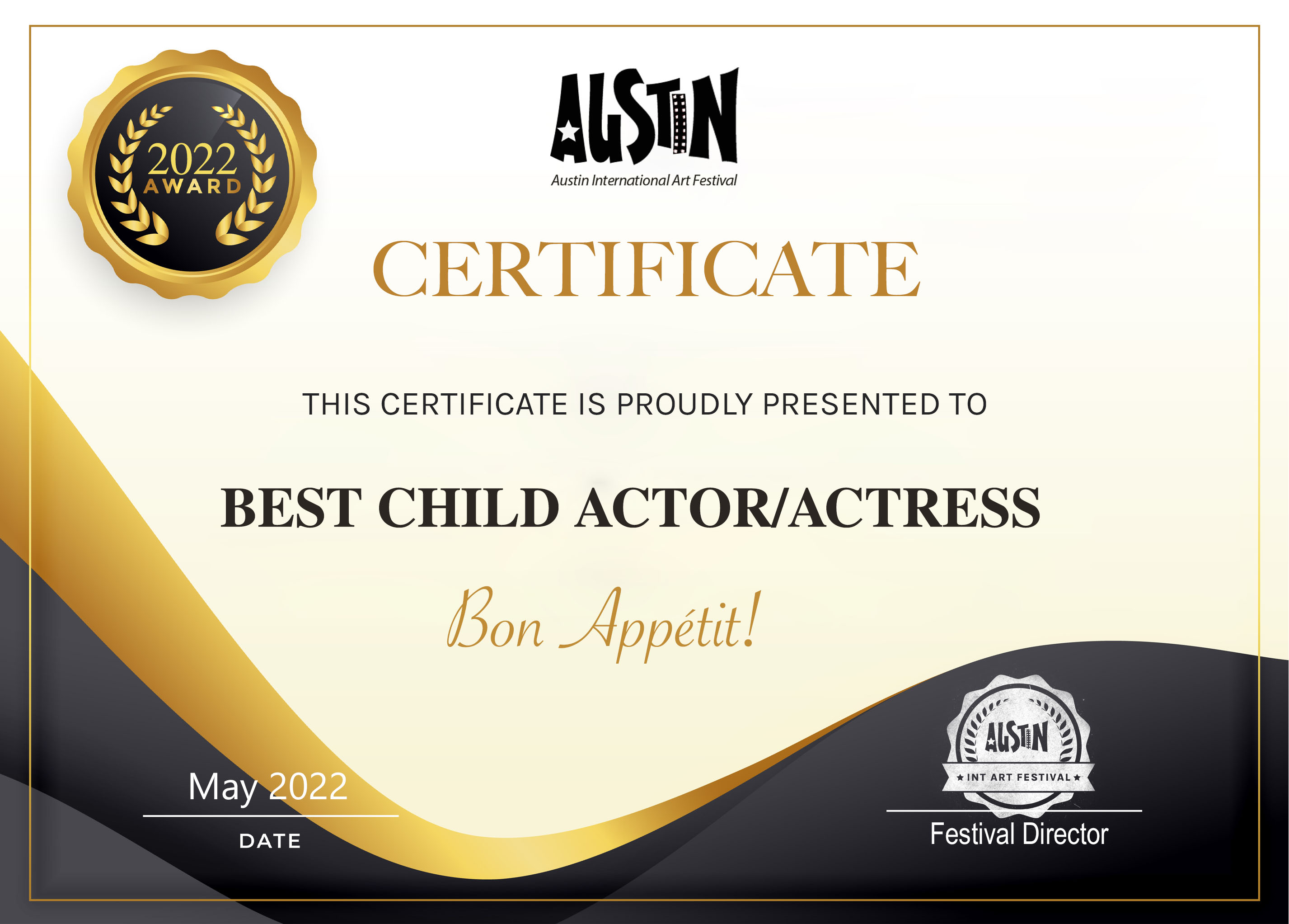 Bon Appétit! /Best Child Actor/Actress | certificate